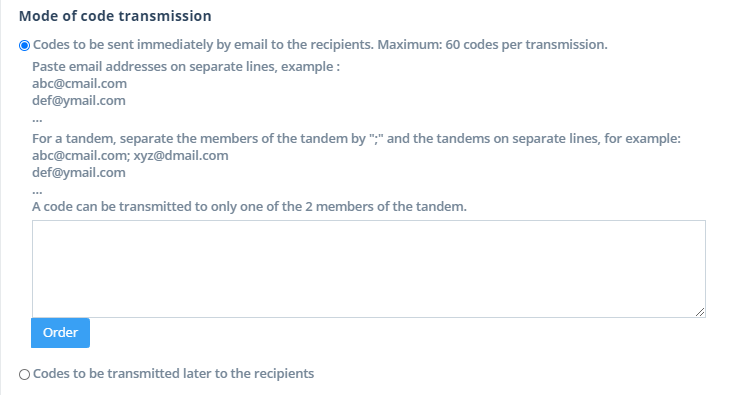 By clicking on the Order button, an email communication will be sent to each recipient with the activation code and instructions to proceed. This communication is identical to the one you can send with the Send by Email action in the Manage Activation Codes table.