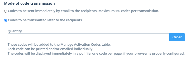 Choosing this option will display an input box to indicate the number of activation codes to be ordered.