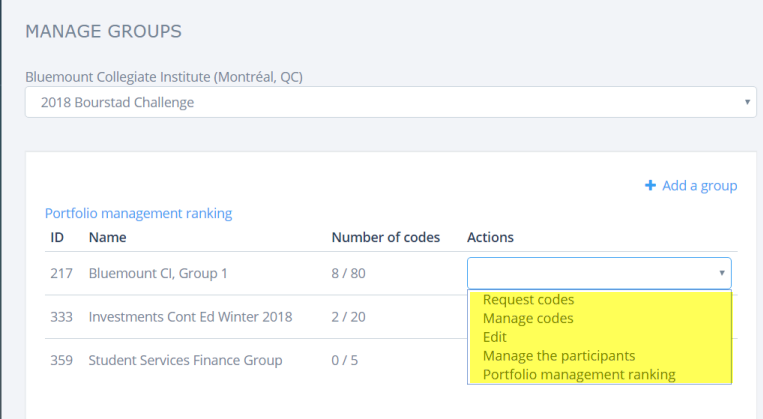 The Manage Groups table gives the list of groups for the Bourstad Challenge or for a private simulation and allows for each group to perform 5 separate actions.