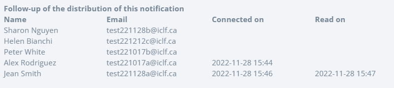 On this image, we can see that the notification targets 6 participants. Since the notification was issued, two of these participants have logged on to the Bourstad platform, Alex Rodriguez and Jean Smith. Only Jean Smith effectively viewed the notification during a work session on the Bourstad platform.